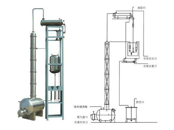 粗餾塔的工作原理為發酵成熟醪通過預熱后,進入粗餾塔中的上部,塔底不斷均勻地通入加熱蒸氣,這時由于加熱的作用就可將成熟醪中液態酒精轉變為酒精氣體,同時其它低沸點和揮發性的雜質,都成為氣態,和酒精一同進入排醛塔中(也可直接進入精餾塔),塔底將蒸餾后的廢糟排出塔外。